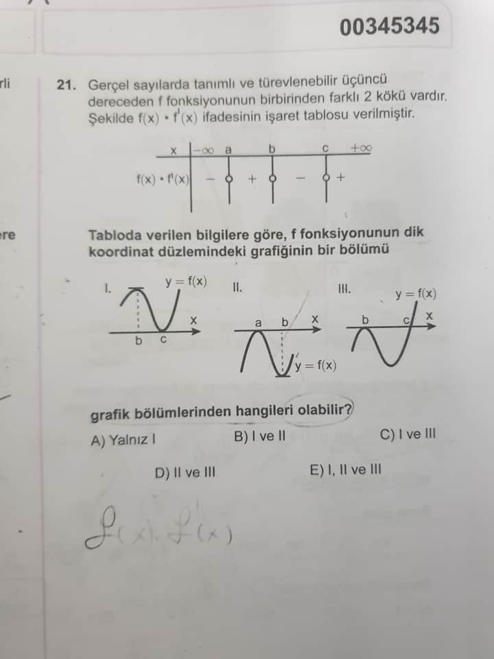 Soru: Üçüncü dereceden ve gerçel sayılarda tanımlı, türevlenebilir bir f fonksiyonunun birbirinden farklı 2 kökü olduğu ve f(x)·f′(x) ifadesinin yukarıdaki şekildeki gibi bir işaret tablosuna sahip olduğu verilmiştir. Tabloda yer alan bilgilere göre, seçeneklerde gösterilen I, II ve III numaralı grafiklerden hangileri bu fonksiyonun dik koordinat düzlemindeki olası bölümleri olabilir?