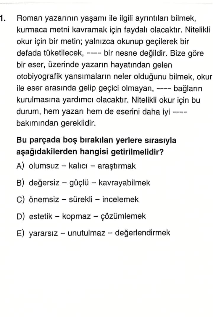 | D | estetik | kopmaz | çözümlemek | 1. Boşlukta “estetik” ifadesi ters bir anlam yaratıyor. |