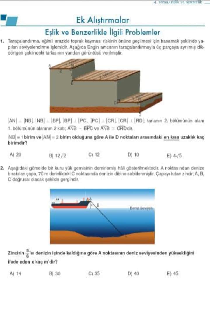 - İkinci soruda zincirin kısmı suya battığı için üçgen benzerliği ve oran kullanılır; sonuç 35 m olur.