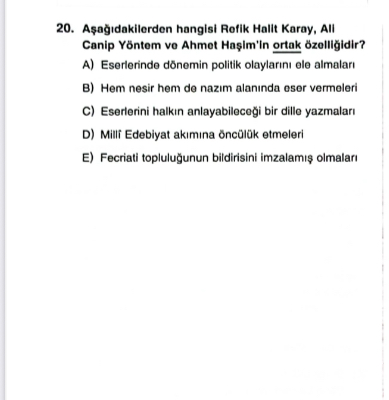 Bu soru, Türk edebiyatının önemli yazar ve şairlerinden olan Refik Halit Karay, Ali Canip Yöntem ve Ahmet Haşim’in ortak özelliğini sorgulamaktadır. Yazarların edebî akımlar içindeki konumları, eser verdikleri türler ve topluluklara katılımları bu sorunun odak noktasıdır.