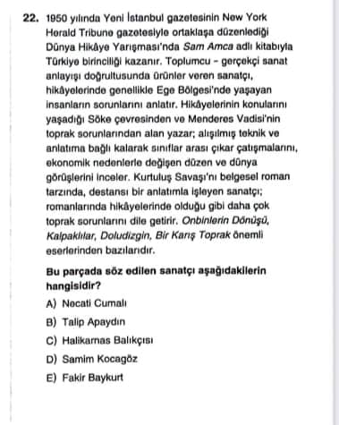 Soruda, 1950 yılında Yeni İstanbul ve New York Herald Tribune gazetelerinin ortaklaşa düzenlediği Dünya Hikâye Yarışması’nda Sam Amca isimli kitabıyla Türkiye birinciliği kazanan, toplumcu-gerçekçi anlayışla Ege Bölgesi’ndeki insanların sorunlarına eğilen bir yazarın kim olduğu sorulmaktadır. Soru metninde ayrıca Kalpaklardır, Doludizgin, Onbirincin Dönüşü, Bir Karış Toprak gibi eserlerin de yazarın önemli yapıtları arasında yer aldığı belirtilir.