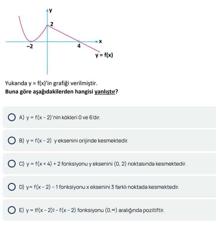 | A) | $y = f(x - 2)$‘nin kökleri 0 ve 6’dır. | Doğru (Kök kayması mantığı geçerli) |