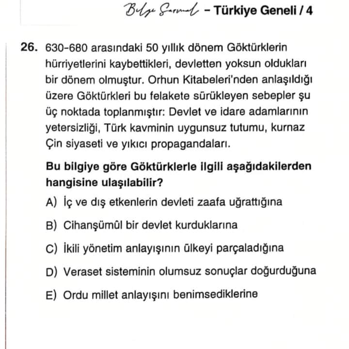 26. Soru: 630-680 arasındaki 50 yıllık dönemde Göktürklerin hürriyetlerini kaybettikleri, devletten yoksun oldukları bir dönem olmuştur. Orhun Kitabeleri’nden anlaşıldığı üzere Göktürkleri bu felakete sürükleyen sebepler şu üç noktada toplanmıştır: Devlet ve idare adamlarının yetersizliği, Türk kavminin uygunsuz tutumu, kurnaz Çin siyaseti ve yıkıcı propagandaları. Bu bilgiye göre Göktürklerle ilgili aşağıdakilerden hangisine ulaşılabilir?