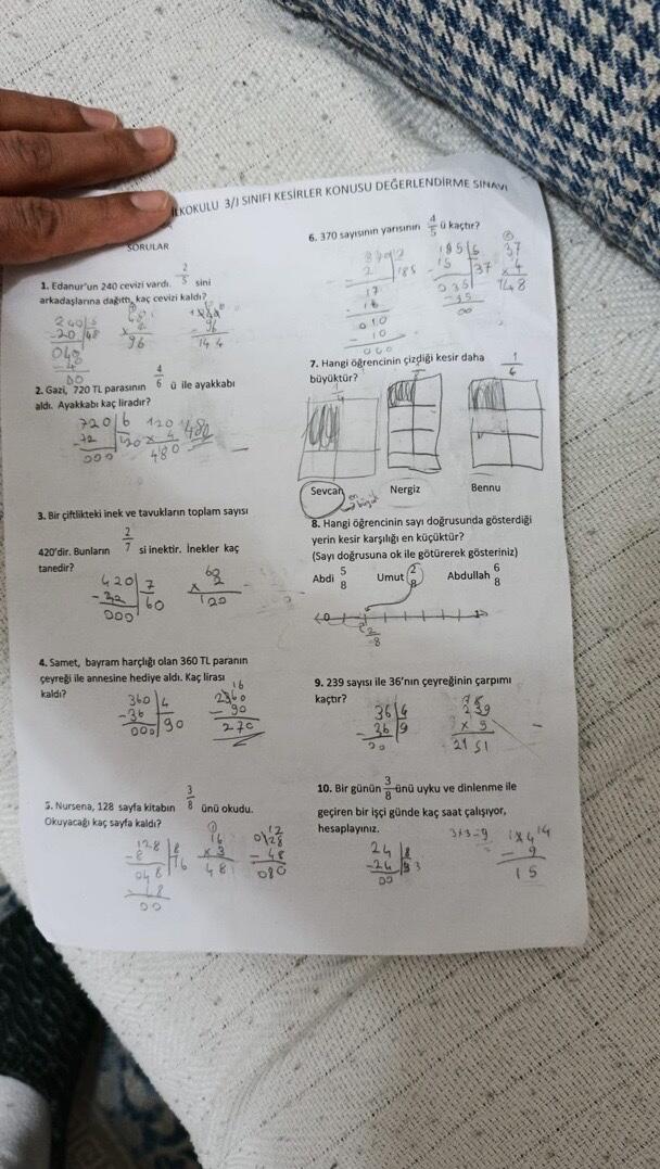 DEĞERLENDİRME SIAV KOKULL 3/) SINIFI KESIRLER KONUSU DEGERLEND 6.370 saysnan yarsının 0kactr? 1856 5 o151 1. Edanurun 240 cevizi vardi. Ssin arkadasarına daitth, kaç ceviz ka 20 4 2. Gazi, 720 TL parasinin ald, Ayakkabı kaç liradır? D00 48 92 0 ile ayakkabı 37 Hangi örencinin cizdigi kesir daha 7. büyüktür? SORULAR 3. Bir çiftlikteki inek ve tavukların toplam says 2 420 dir, Bunların7 si inektir. Inekler kaç tanedir? - La Lo n 360 TL paranın d Kac lir 4. Samet, bayram a g ile annesine hediye aldı. Kaç lirası, 3604 003 (Sevcan e Nergi Bennu ầroncinin savı doğrusunda gösterdiği arüktür? &. Hangi öğrene (Savı doğrusuna ok ile götürerek gösteriniz) yi do Abdi Umut Abdullah 9.239 sayısi ile 36’nın çeyreğinin çarpimı kaçtır? . Nursena, 128 sayfa kitabın Okuyacağy kaç sayfa kaldi? 10. Bir günün ünü uyku ve dinlenme ile geçiren bir işçi günde kac saat calısıyor, hesaplayıniz. 2L1 2 S3-9 x4 5 ünü okudu. o\f o