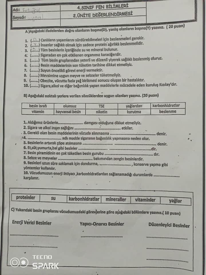 Görselde, 4. Sınıf Fen Bilgisi dersinin 2. ünite değerlendirmesi bulunmakta. Sorular ve ifadeler beslenme konusuyla ilgili.