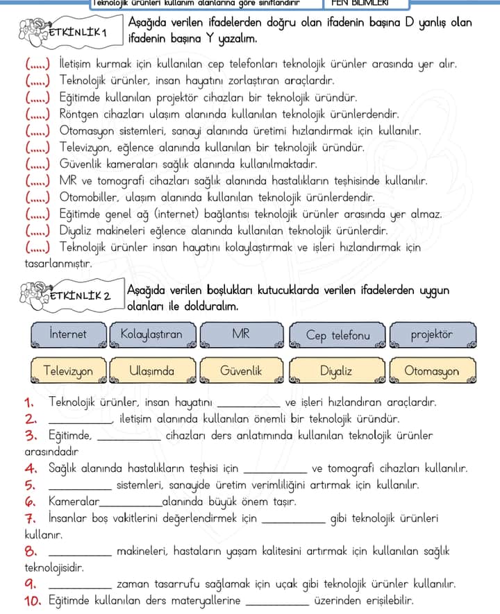- Y — Yanlış; teknolojik ürünler insan hayatını kolaylaştıran araçlardır.