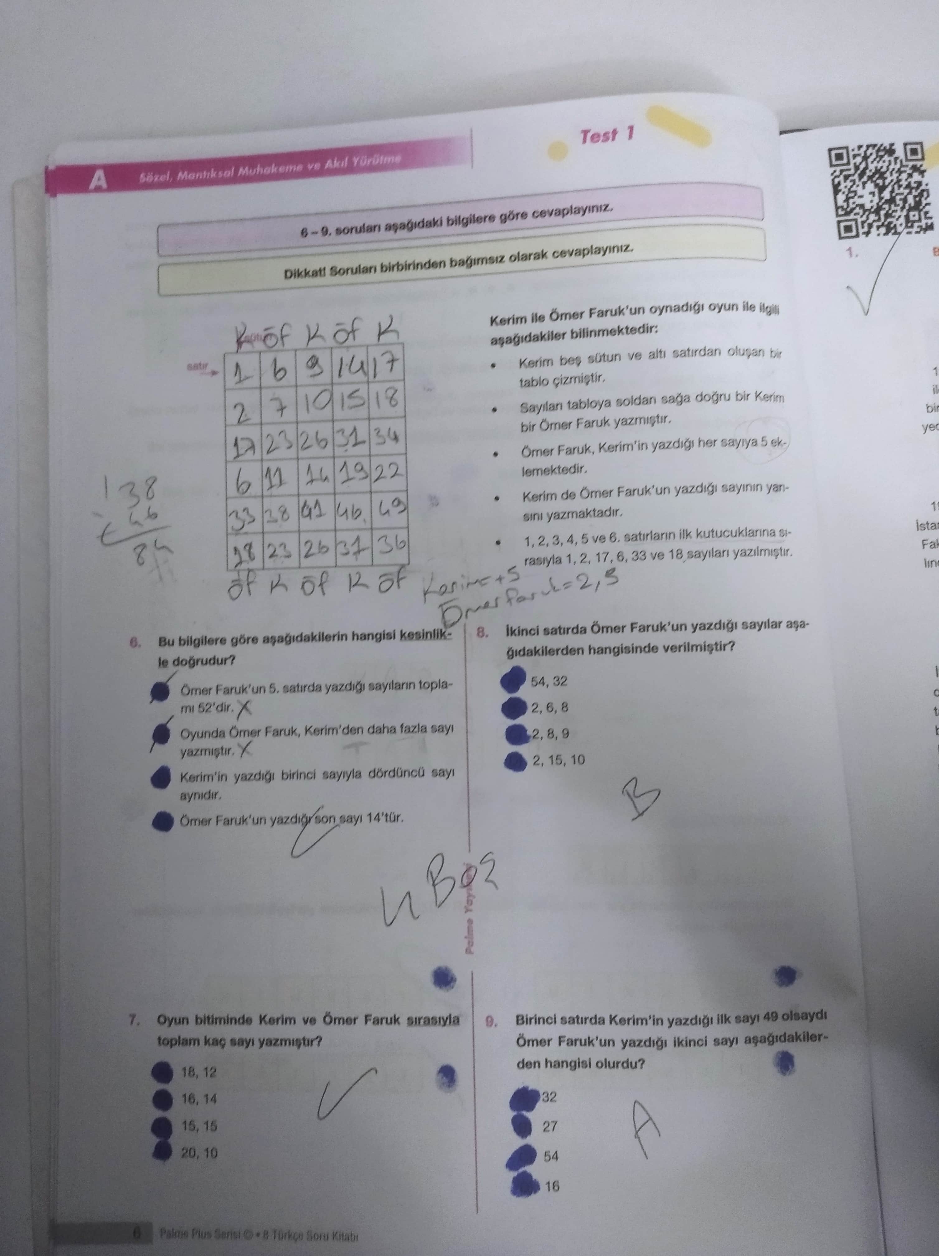 İkinci satırdaki Ömer Faruk’un sütunlarında bakıldığında sayılar şu şekilde görülüyor: 2, 8, 9. Bunun doğru cevabı seçeneklerden bulunması gerekir.