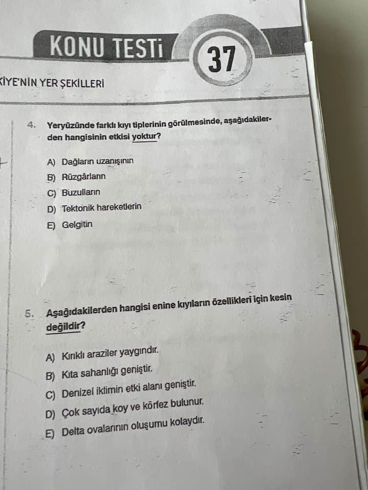 4. Soru: Yeryüzünde farklı kıyı tiplerinin görülmesinde, aşağıdakilerden hangisinin etkisi yoktur?