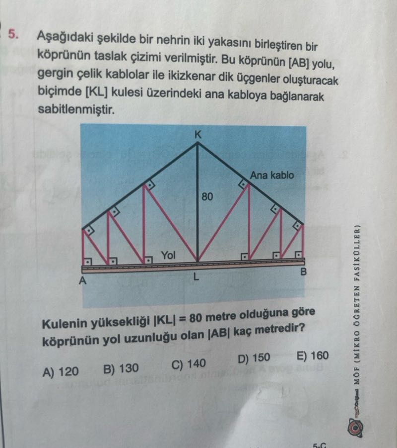 - Aşağıdaki şekilde bir nehrin iki yakasını birleştiren bir köprünün taslak çizimi verilmiştir. Bu köprünün [AB] yolu, gergin çelik kablolar ile ikizkenar dik üçgenler oluşturacak biçimde [KLJ kulesi üzerindeki ana kabloya bağlanarak sabitlenmiştir. Ana kablo 80 Yol Kulenin yüksekliği |KLĮ = 80 metre olduğuna göre köprünün yol uzunluğu olan |AB| kaç metredir? A) 120 B) 130 C) 140 D) 150 E) 160