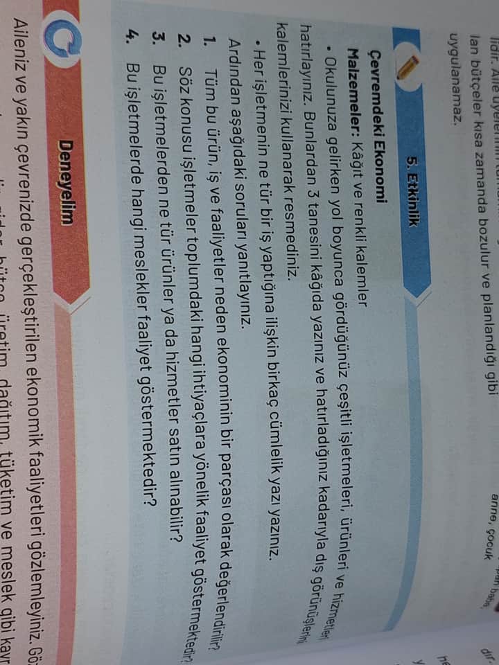 Soru: “Okulunuza gelirken yol boyunca gördüğünüz çeşitli işletmeleri, ürünleri ve hizmetleri yazınız ve hatırladığınız kadarıyla dış görünüşlerini kâğıda resmediniz. Ardından aşağıdaki soruları yanıtlayınız: