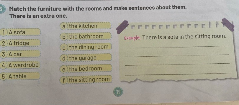 5 Match the furniture with the rooms and make sentences about them. There is an extra one. a the kitchen (bthe bathroom (c the dining rOom (d the garage e the bedroom (f the sitting room 1)A sofa 2) A fridge 3)A car 4) A wardrobe 5) A table rrrrrrrrrrEtt Example: There is a sofa in the sitting room. ************* *** suun**uaae … t**** **** ss .ensassenvausnnsens. so*********esssssessneht