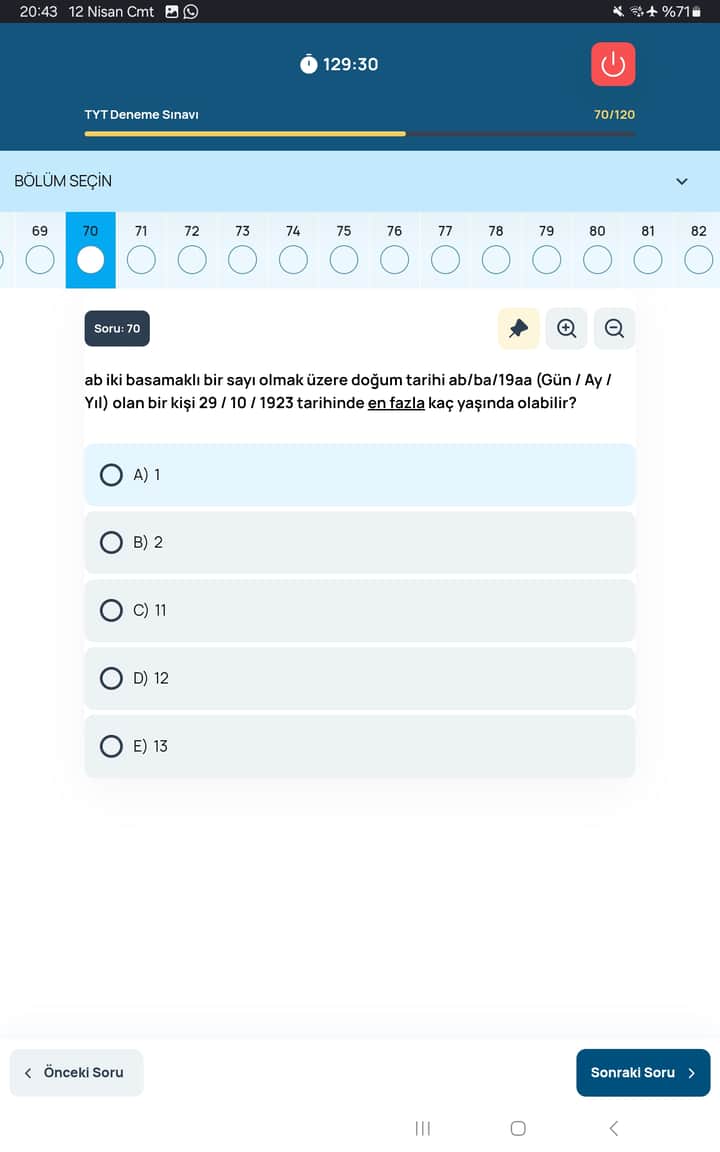 “ab iki basamaklı bir sayı olmak üzere, doğum tarihi ab/ba/19aa (Gün/Ay/Yıl) olan bir kişi 29/10/1923 tarihinde en fazla kaç yaşında olabilir?”