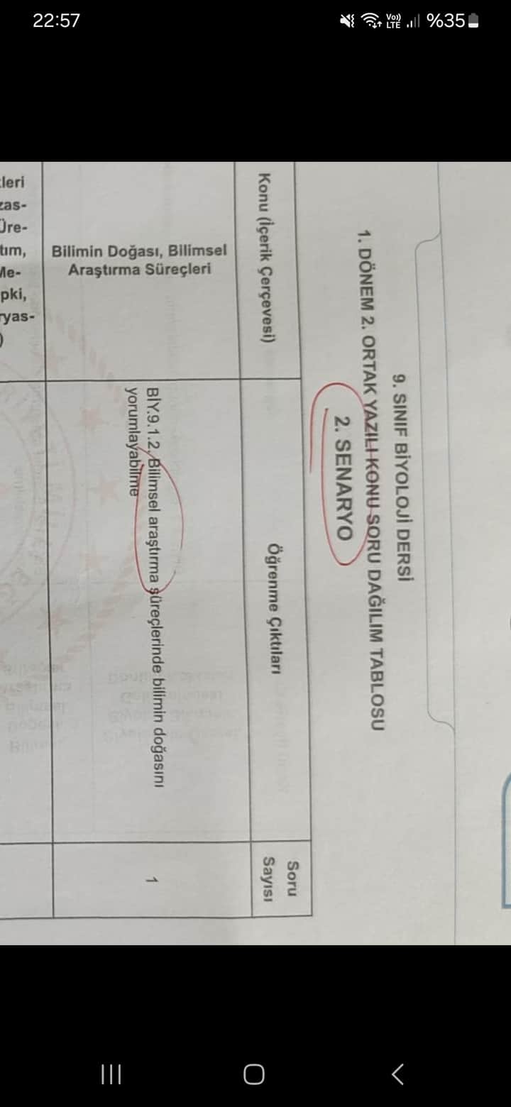 Bu görüntü üzerinde “9. Sınıf Biyoloji Dersi 1. Dönem 2. Ortak Yazılı Konu Soru Dağılım Tablosu” başlığı yer almakta. Tabloya göre, 2. senaryo kapsamında “Bilimin Doğası, Bilimsel Araştırma Süreçleri” konusundan bahsediliyor. Öğrenme çıktıları kısmında “Bilimsel araştırma süreçlerinde bilimin doğasını yorumlayabilme” ifadesi yer almaktadır. Soru sayısı ise 1 olarak belirtilmiş. Bu tablo, 9. Sınıf biyoloji dersinde işlenecek sınav konularını ve bu konuların sınavda nasıl değerlendirileceğini göstermektedir. Senaryo temelli soru dağılımı, öğrencilerin bilimsel araştırma süreçlerini ve bilimin doğasını anlamalarını hedeflemektedir.