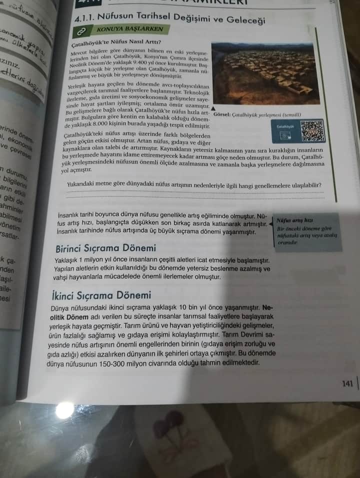 9. Sınıf Coğrafya Ders Kitabı Sayfa 141 İçeriği: Çatalhöyük Nüfus Tarihsel Değişimi ve Geleceği