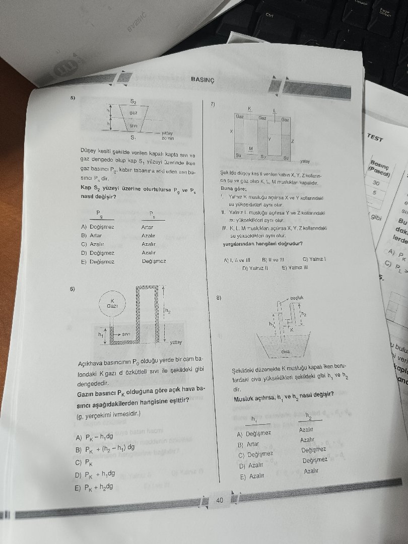 Sonraki Adımlar: Hangi numaralı soruyu ayrıntılı çözmemi istersiniz — 5. (üst yüzeye S2 konulunca P değişimleri), 6. (açık hava-cam boru civa dengeleme) veya diğerlerini mi çözeyim? @Mustafa_Baran
