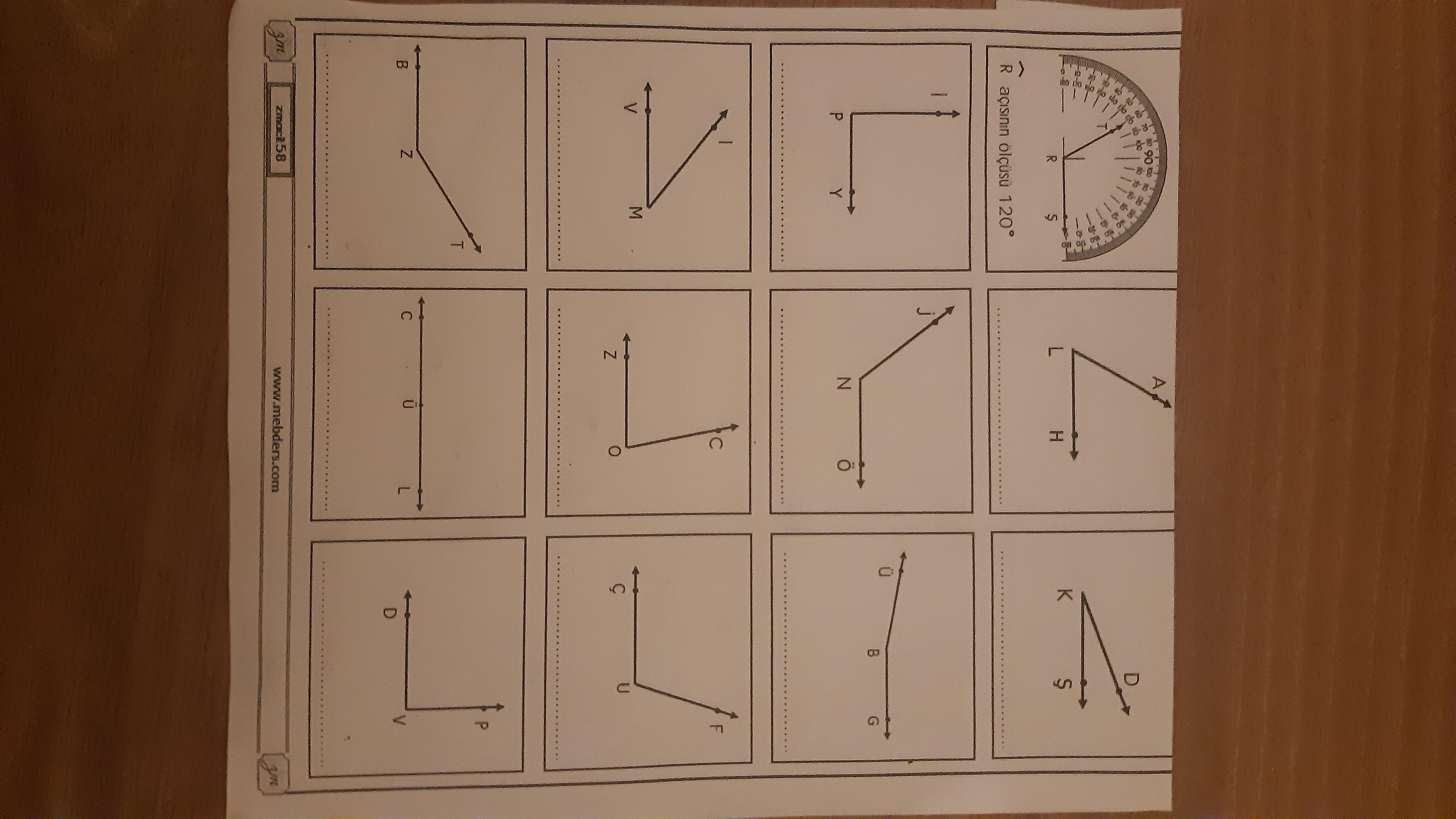 Açı ölçer (iletki) kullanarak, elinizdeki çalışma kâğıdındaki açıları ölçmek için aşağıdaki adımları izleyebilirsiniz. Elinizde gerçek bir açı ölçer (iletki) varsa, aynı yöntemle her bir açıyı kolayca ölçüp kâğıda not edebilirsiniz.