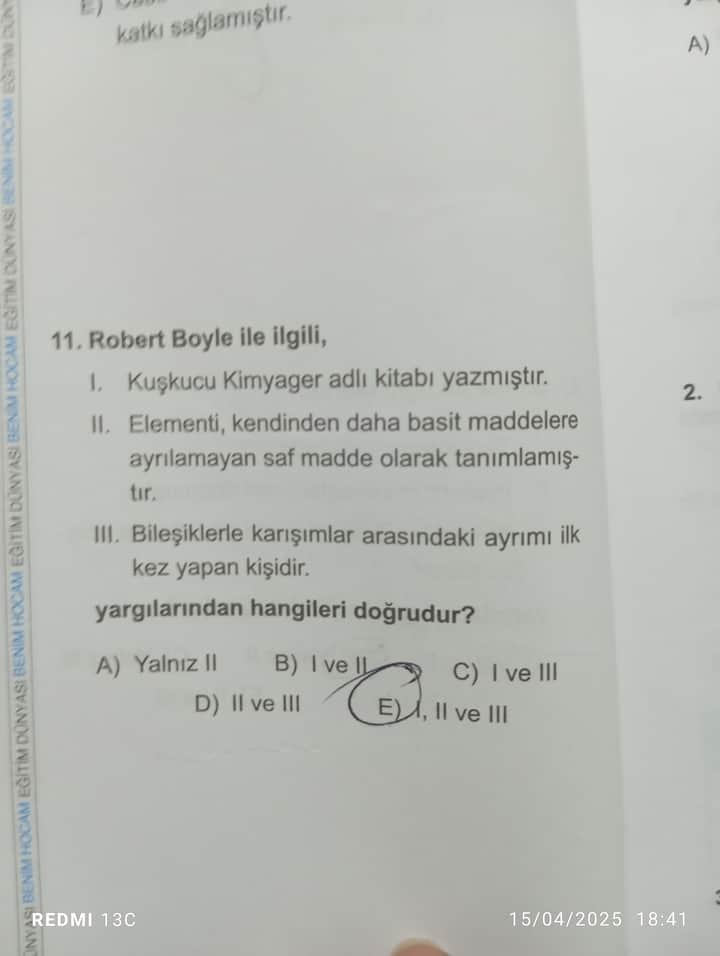 Robert Boyle’un kimya tarihindeki yeri ve yaptığı tanımlamalar, sorudaki üç yargının neden doğru olduğunu açıklar: