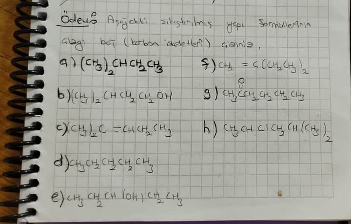 Soru: Aşağıdaki sıkıştırılmış yapı formüllerinin çizgi–açı (skeletal) formüllerini, el çizimi tarzında gösteriniz.
