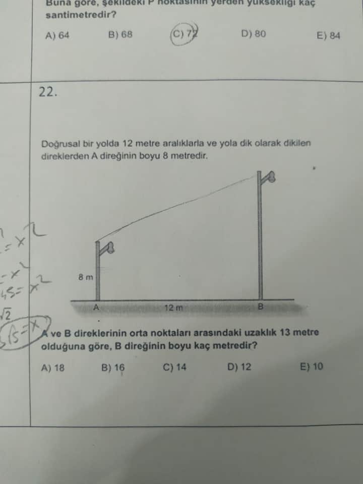 22. Soru: A ve B direkleri 12 metre aralıkla yola dik dikilmiştir. A direğinin boyu 8 metredir. A ve B direklerinin orta noktaları arasındaki uzaklık 13 metre olduğuna göre, B direğinin boyu kaç metredir?