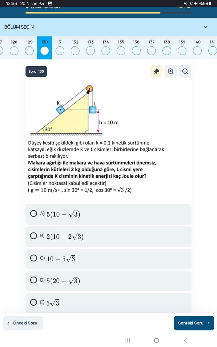 - Eğik düzlem 30° eğimli, K bloğu 10 m’lik (ip boyu kadar) bir mesafeyi yukarı çıkıyor.
