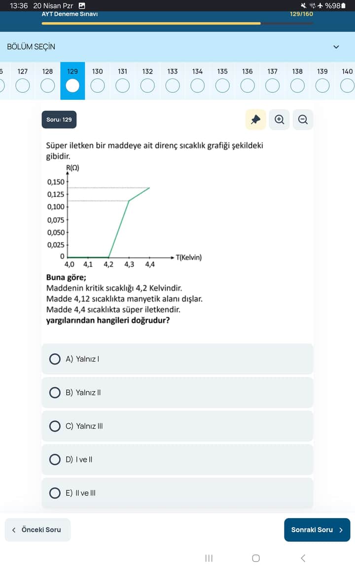 - Yanlış, çünkü kritik sıcaklık olan 4,2 K üzerine çıkıldığında madde süper iletkenlik özelliğini kaybeder ve direnç tekrar ortaya çıkar. Grafikten 4,4 K’da maddenin süper iletken olmadığı, direnç gösterdiği görülmektedir.