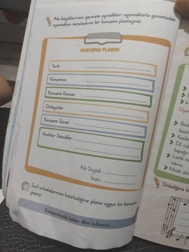 Bu konuşma planı, aile büyüklerinin çocukluk döneminde oynadıkları oyuncakların özelliklerini ve günümüz oyuncakları ile farklarını karşılaştıran bir konuşma için rehber niteliğindedir. Temel olarak tarih, konuşmacı, konuşma konusu, dinleyici kitlesi, süre ve anahtar kelimeler belirlenmelidir.