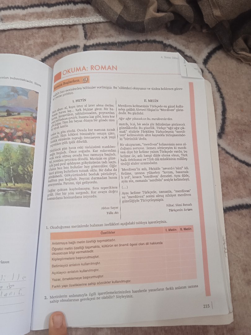ala budunaktaisy, S lasn OKUMA: ROMAN ya Başlarken leden bölümler verilmiştir Bu bolümleri olkuyunuz ve sizden beklenen görev . METİN praklar a. krgtn ister al iscer alma derleMerdiven kelimesinin Türkçede en güzel kalla- hurasL lonuodan prdanmei Fiagnin “erdiven” iirin- insana kar gibi, kaTa kor Ar ağr etkaoaksn bu merdiverierden eim hir bevaz dünya bir günde tüm keilit Be gin stürdu. Ovada kar natt inlein toprağı örtemeyen açık ors inlik iplik dikeldi. iven" kelimesinir hir asuylenten sölevevim ki merdi- gun hava eski tiürküsünü murddan- lad, Önce soguda. Kar sularindanDyen dive bir kelime valnız, Türkçede vardr, bu ck olmuş ovada buz tutrmaya bi.kelime de, aslh hangi dilde olursa olsun, bolmuştu. Sra tepeciklere Dagiar gon sarondı, Kar ovaya doğru bamurdana homurdana iniyordu. güzellilktedir. Bu gizeik. Thrkep "raör el malk söziyle Fârisiden Türkçeleşmig “merdi- veşilsm atin kayntkla birlegmesinde- he ni ssldavan gökyüziinin tadi kactı. atkdenSinin ve duusikismn 1e hoz bulutlar boy gösterdiler, Öğleg s ash, Fáriside 'neverd-i bàm” idi. Ls bulutlara tutsak oldu. Btr dana di llselen "kpm, basamak- rizukmedi. Gokytznodan bzan l yol’ kısaca "merdiven’ denmekti. Aynu dide, fften pus tipi geliyordu. aynı söz, zamanla ‘nerdhan’ sesiyle kelimelesti, …) Ahbas Sayar Ylku Att Betimleyic anlatim kullanılrnsştır. Açıklayıci anlatim kullanitmıştır. II. METİN musråı, bizi, bir anảa șir iklinleri Özelikter Anlatmaya bağlh metin özellioi taşımaktadit. 1. Okuduğunuz metinlerde bulunan özellikleri aşağdalki tabloya işaretleyiniz. Yazar, önekdemeye başvurmustur Ogrete lni vermekted etin özelliği taşıunakta, kültürün en önemli ögesi olan dil hakkinda okuyucuya Kişileştirmelere başvurulmuştur. otürecek n kelime Türkcede, zamanla, “merdivan” ve “merdüven’” sesini almus nihâyet merdiven güzelliğiyle 'Türkçeleşmişit. Farklı yapı 6zellilderine sahip sözcükler kullanimıştır. lahilir? Söyleyiniz. Nihad SAmi Banarb Tlirkçenin Srları L Metin . Metin 2. Metinlerin anlatımiyla iigili işaretlemelerinizden hareketle yazarların farklı anlatım tarzna sahip olmalarınan gerekçesi ne 215