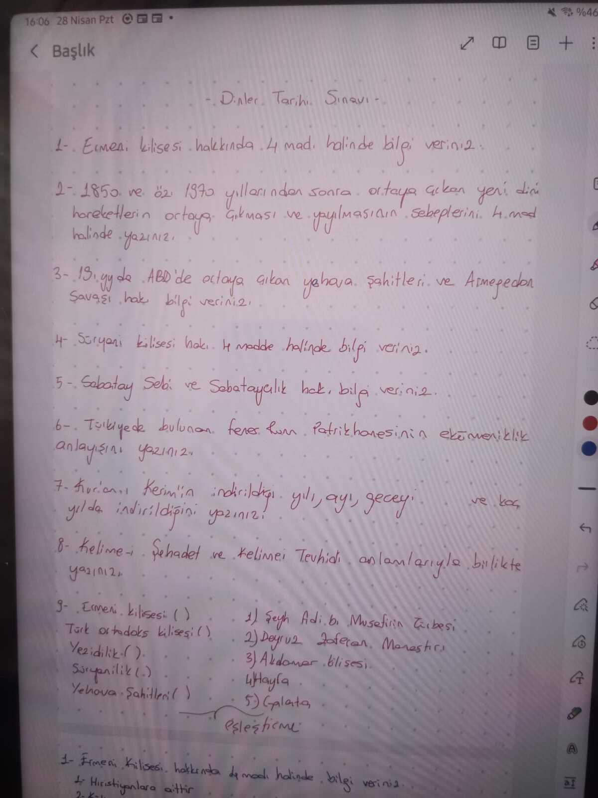 “9. Ermeni Kilisesi (…) Testek Ortodoks Kilisesi (…) Katolik Kilisesi (…) Yeçiltilik (…) Süryanilik (…) Yahova Şahitleri (…) Aşağıdaki ile bağlantılı olanları eşleştirin.”