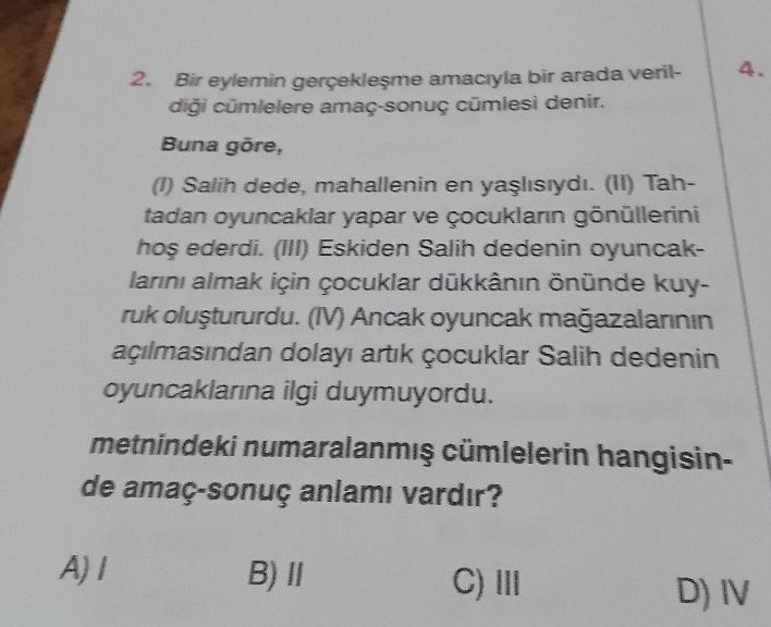 - Bir eylemin gerçekleşme amacıyla bir arada veril- diği cũmlelere amaç-sonuç cũmlesi denir. Buna göre, () Salih dede, mahallenin en yaşlısıydı. () Tah- tadan oyuncaklar yapar ve çocukların gõnūllerini hoş ederdi. (I) Eskiden Salih dedenin oyuncak- larını almak için çocuklar dūkkânın önünde kuy- ruk oluştururdu. () Ancak oyuncak mağazalarinın açılmasindan dolayı artik çocuklar Salih dedenin oyuncakarına ilgi duymuyordu. A) I metnindeki numaralanmış cünlelerin hangisin- de amaç-sonuç anlami vardır? B) II 4. D) IV