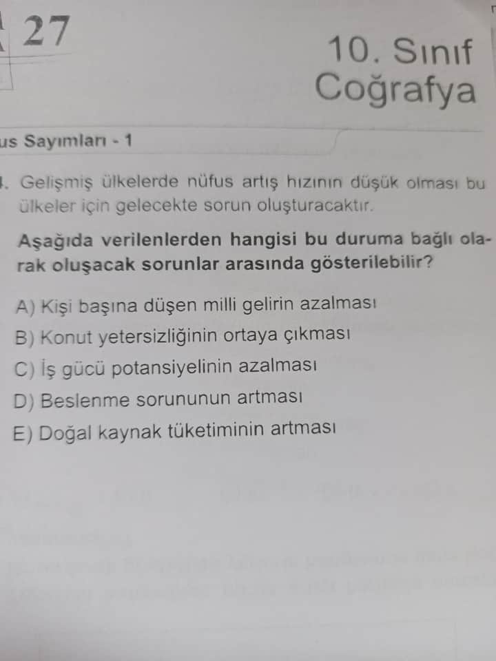 - Seçenek (E) “Doğal kaynak tüketiminin artması” da hızlı büyüyen nüfus veya sanayi atılımlarıyla bağlantılıdır. Nüfus artışı düşük olduğunda genel tüketim artışı da sınırlanabilir.