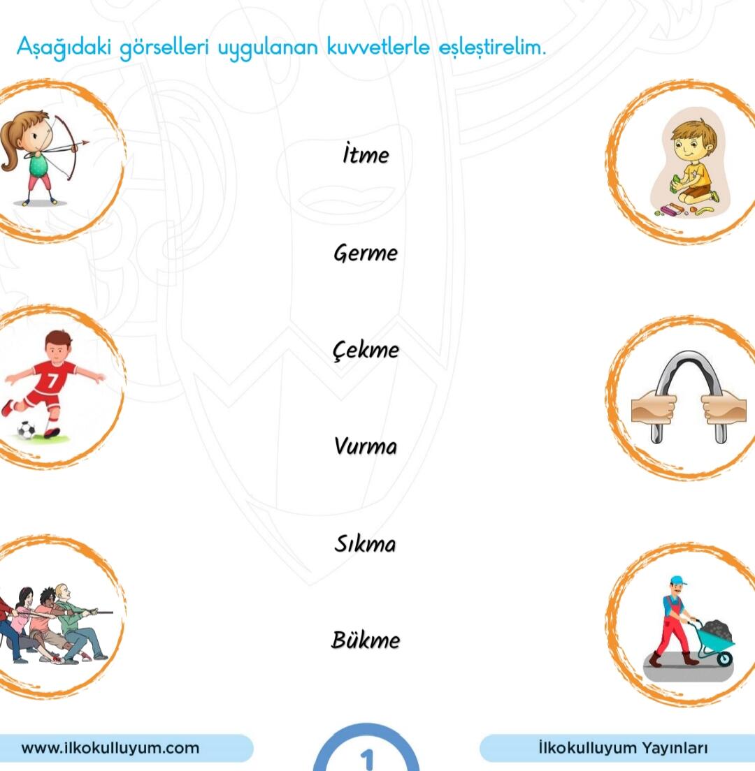 Bu görsellerdeki hareketleri ve uygulanan kuvvet türlerini eşleştirmek için her görseldeki hareketin hangi kuvvet türüne karşılık geldiğine bakalım.