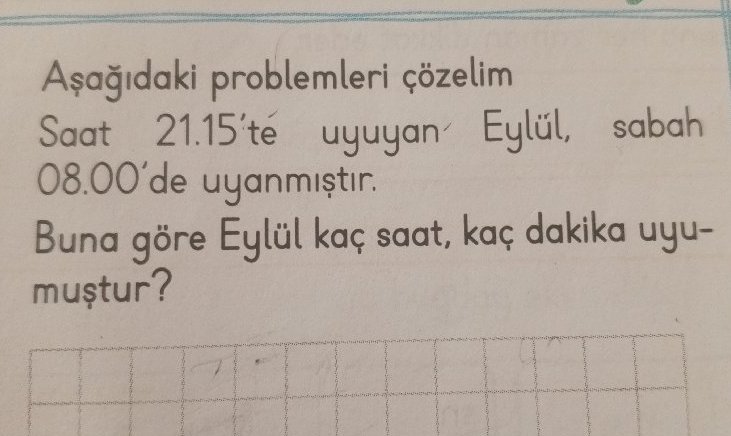 Aşağıdaki problemleri çözelim: Saat 21.15’te uyuyan Eylül, sabah 08.00’de uyanmıştır. Buna göre Eylül kaç saat, kaç dakika uyumuştur?