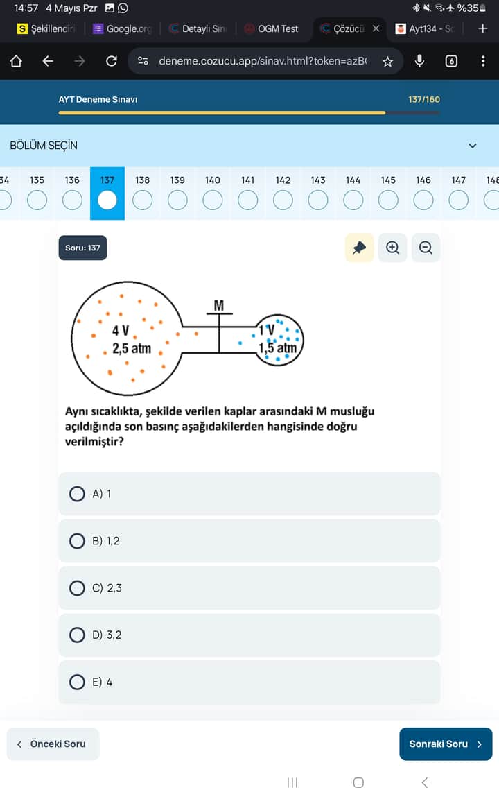 Aynı sıcaklıkta 4V hacimli (2,5 atm) ve 1V hacimli (1,5 atm) iki gaz kapları musluktan birleştiklerinde son basınç nasıl bulunur?