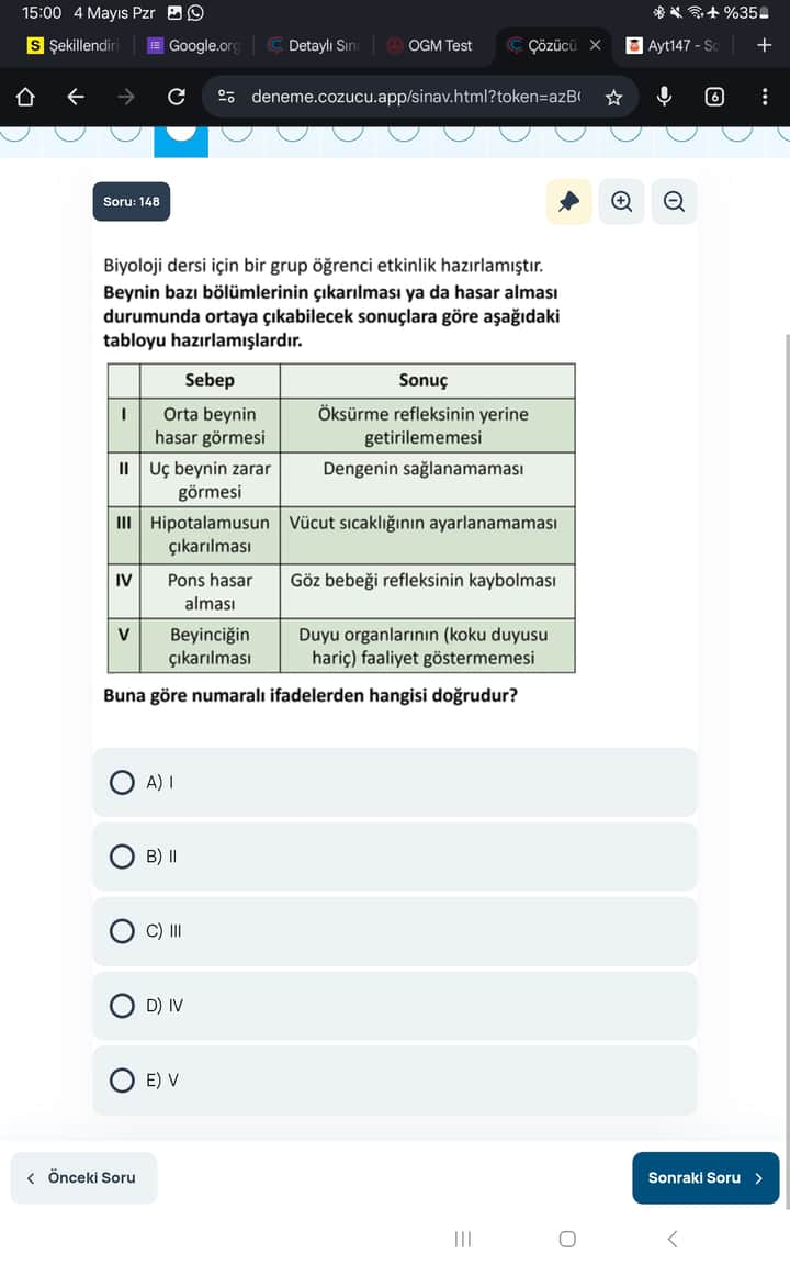Soruda, beynin çeşitli bölümlerinin çıkarılması ya da hasar alması durumunda hangi sonuçların ortaya çıkabileceği ile ilgili bir tablo verilmiş. Doğru olan seçeneği bulmak için her maddeyi inceleyelim: