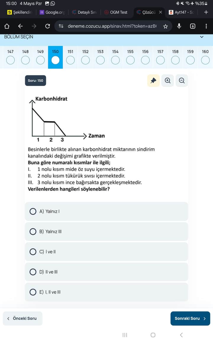 • 3 numaralı kısım ise “ince bağırsakta gerçekleşmektedir” (III) ifadesiyle uyuşur; karbonhidrat sindiriminin büyük bölümü ince bağırsakta tamamlandığından (III) doğrudur.
