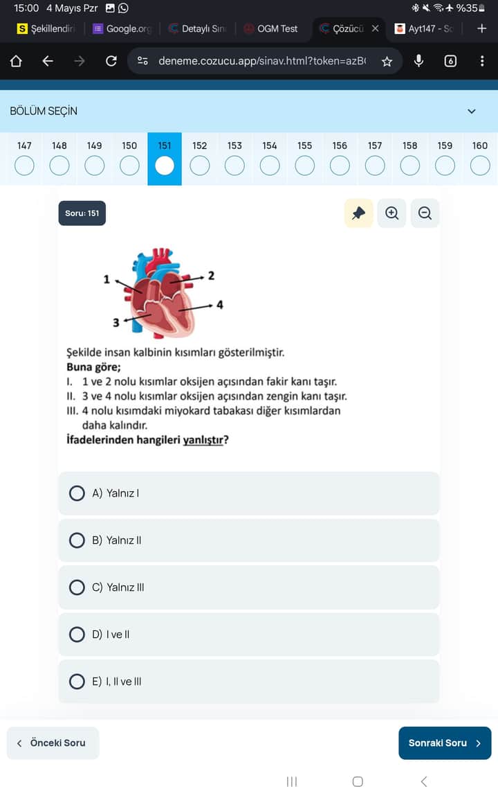 - 3 numaralı kısım (sağ ventrikül/atrium) de oksijen fakiri kan taşır, 4 numaralı kısım (sol ventrikül) ise oksijen zengini taşır → II. ifade yanlış.
