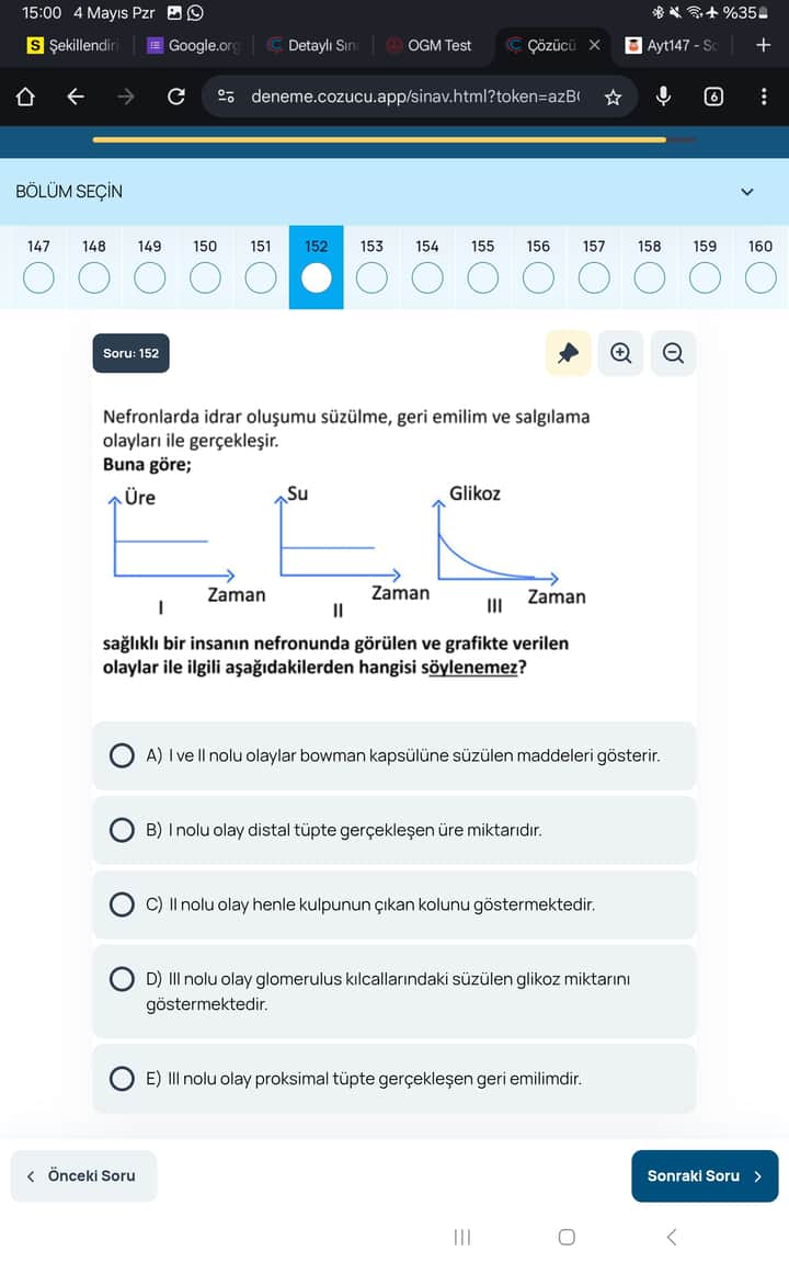 “III nolu olay glomerulus kılcallarındaki süzülen glikoz miktarını göstermektedir” ifadesi yanlıştır; çünkü III grafiği glikozun proksimal tüpte geri emilimini (azalan miktarını) göstermektedir.