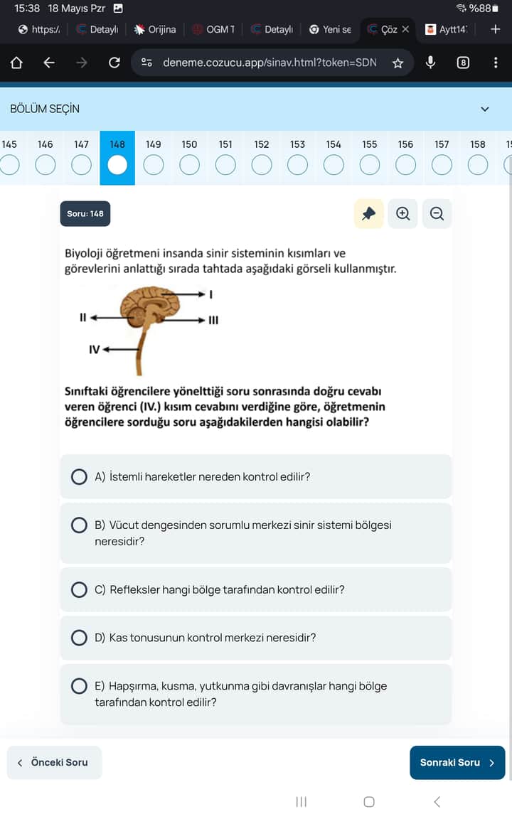 | “Sınıftaki öğrencilerden doğru cevap olarak ‘IV’ yanıtı alan bir soru” | Refleksler hangi bölge tarafından kontrol edilir? (C) |