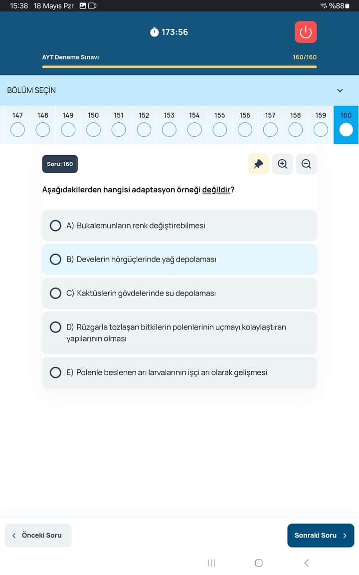 - Sonuç: Bir çöl hayvanının suyu yağ olarak depo etmesi veya bir bitkinin kuraklıklara dayanıklı hale gelmesi gibi çevre koşullarına özgü, doğrudan yaşama şansı artıran bir fenotip değildir. Arıların koloni içinde besin çeşidine göre işçi, erkek ya da kraliçe olabilmesi, toplumsal bir gelişim ve kast sisteminin parçasıdır; ancak adaptasyon teriminin kullanıldığı tipik örneklerle kıyaslandığında, “polenle beslenen larvaların işçi arı olması” ifade edildiği biçimde evrimsel bir uyum örneği olmaktan ziyade normal gelişimsel sürece işaret eder. Dolayısıyla (E) seçeneği adaptasyon örneği değildir.