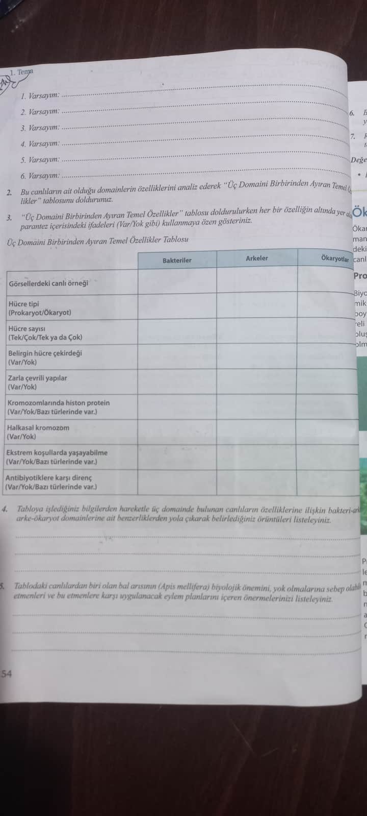 | 2 | Üç domainin özellikleri | Hücre tipi, çekirdek varlığı, histon proteinleri, ekstrem koşullar, antibiyotik direnci. |