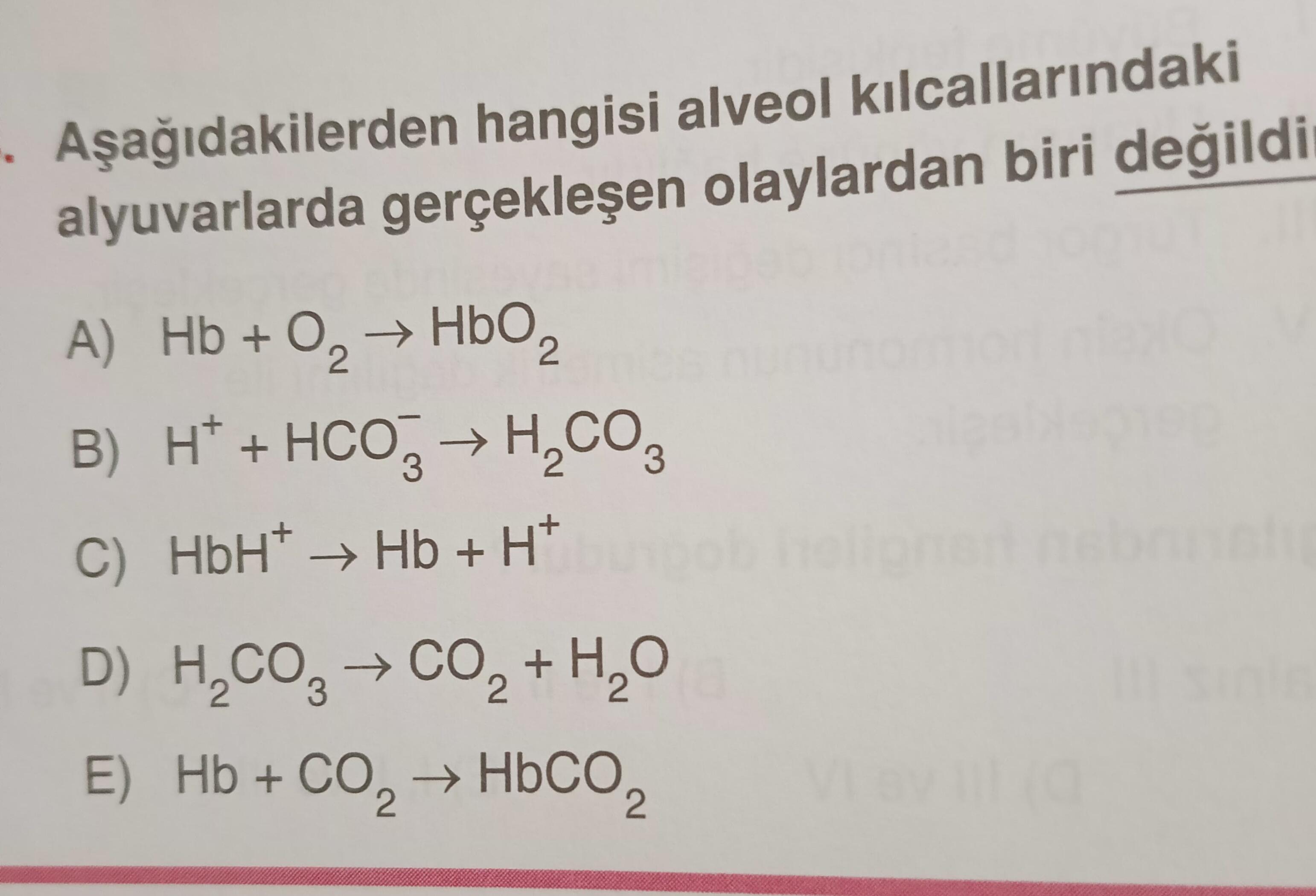 Dolayısıyla sorunun doğru yanıtı E şıkkıdır: (Hb + CO₂ → HbCO₂) alveol kılcallarındaki alyuvarlarda gerçekleşen olaylardan biri değildir.