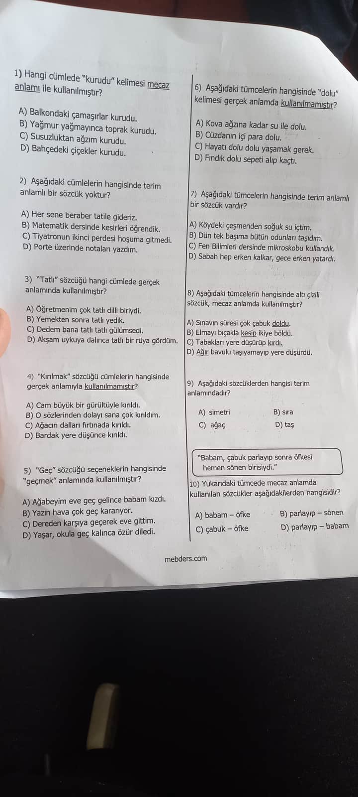 | 1 | C | “Kurudu” burada sınavda mecaz kabul edilen kullanım. |