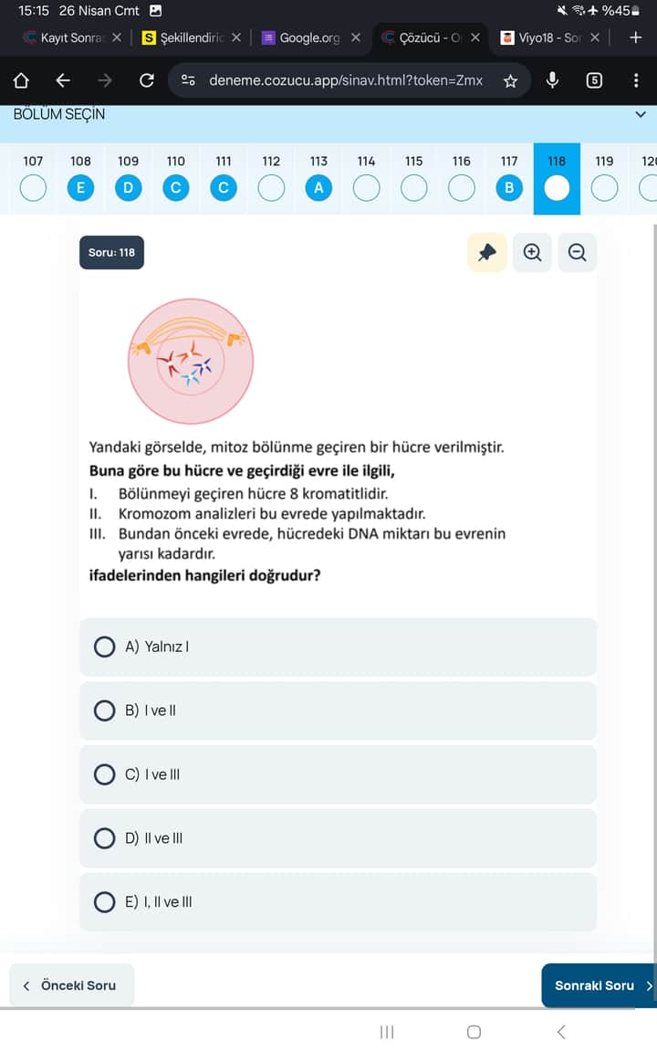 Yandaki görselde, mitoz bölünme geçiren bir hücre verilmiştir. Buna göre bu hücre ve geçirdiği evre ile ilgili ifadelerden hangileri doğrudur?