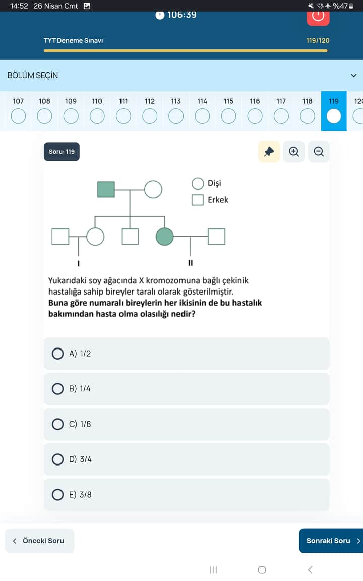 Ama soy ağacında yerleşime ve bireylerin sağlık durumuna dikkat edilmelidir. Görselde netlik olmamakla birlikte çoğu X’e bağlı çekinik hastalık sorusunda cevap 1/8 (C şıkkı) olur.