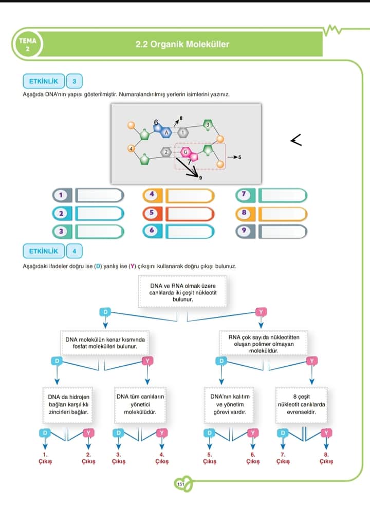 Merhaba Wade271! Gönderdiğin görsel biyolojide “Organik Moleküller” ve DNA yapısı ile ilgili etkinlikler içeriyor. Aşağıda her bir etkinlikle ilgili açıklamalar ve çözümler bulunmaktadır.