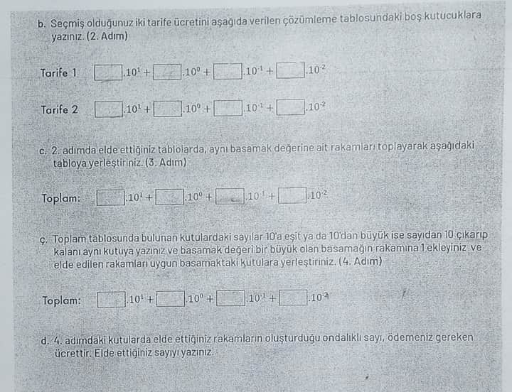 Soru: Verilen çözümleme tablosundaki boş kutucuklara seçilen iki tarife ücretini yazmak, basamak değerlerine göre toplamak ve verilen adımları uygulayarak son ondalıklı sayıyı bulmak.