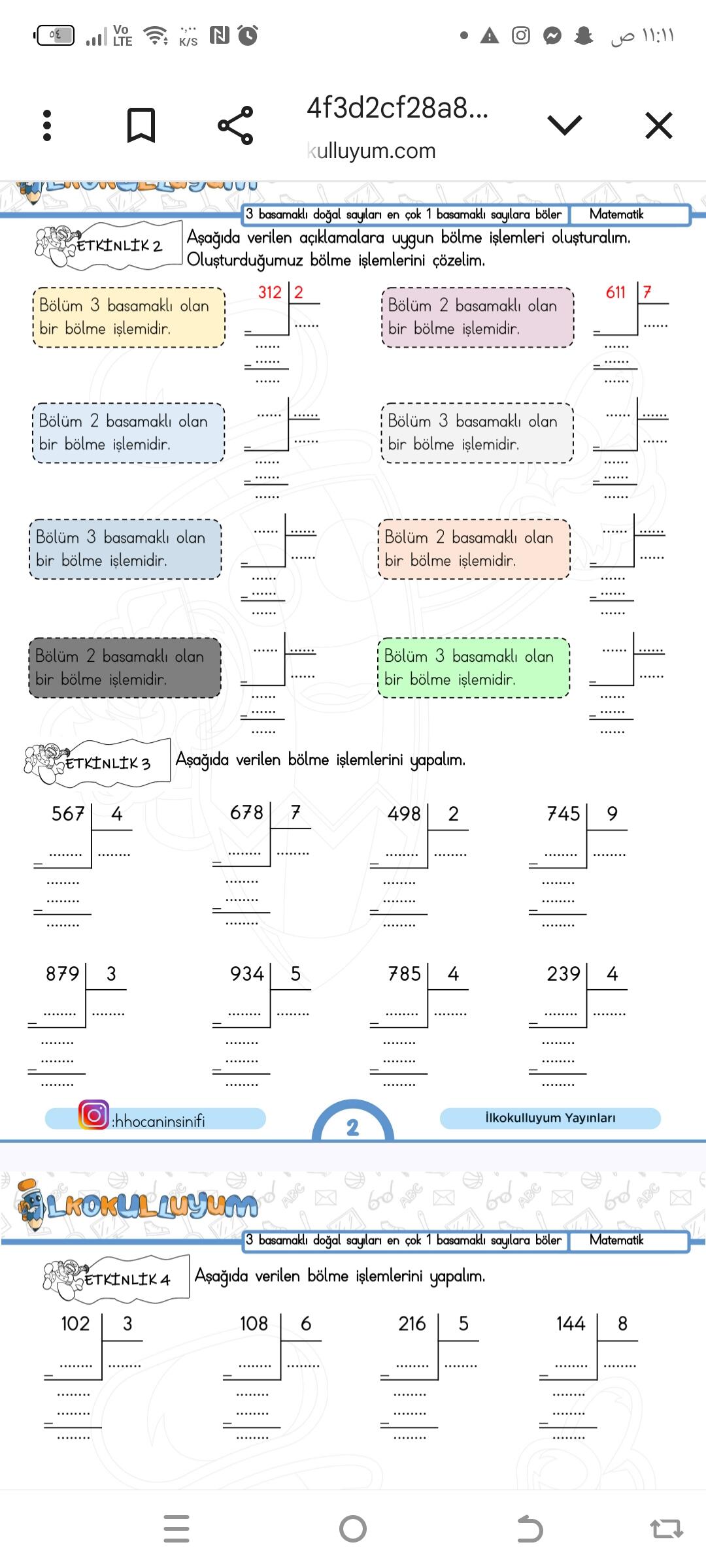 - 3 basamaklı bölenler ve 2 basamaklı bölenler farklı renklerle ayrılmış ve 3 veya 2 basamaklı bölme işlemleri istenmiştir.