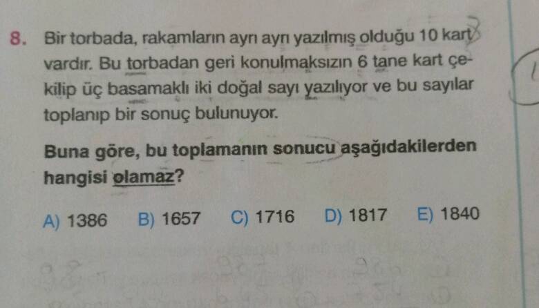 Bir torbada, rakamların ayrı ayrı yazılmış olduğu 10 kart vardır. Bu torbadan geri konulmaksızın 6 tane kart çekilip üç basamaklı iki doğal sayı yazılıyor ve bu sayılar toplanıp bir sonuç bulunuyor. Buna göre, bu toplamanın sonucu aşağıdakilerden hangisi olamaz?