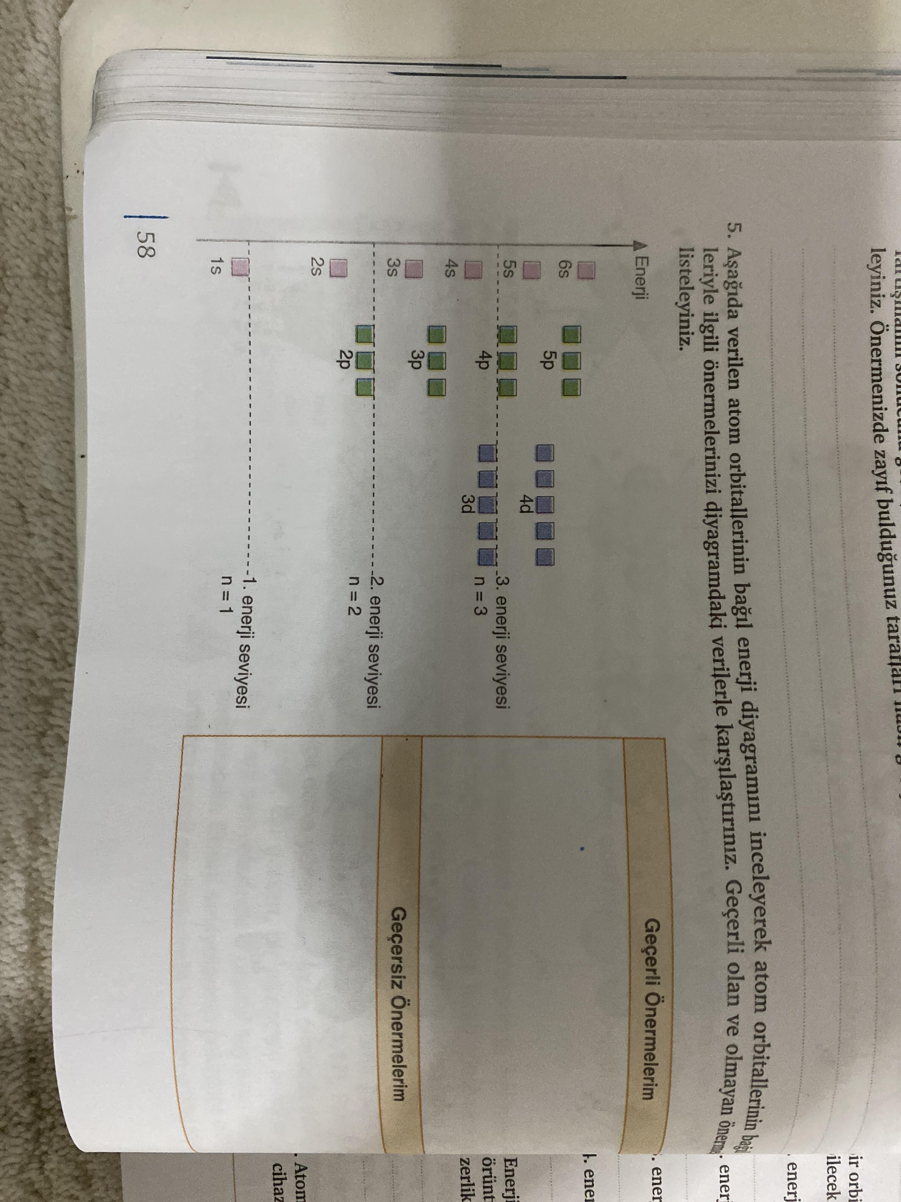 Resimdeki soruda, atomların elektron dizilimleri ve periyodik tablodaki yerleri ile ilgili boşlukları doldurmanız isteniyor. Soruda verilen bilgiler ışığında, atomların elektron dizilimleri ve periyodik tablodaki konumları belirlenmiş.