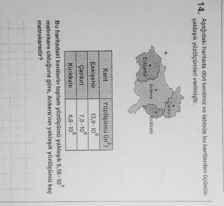 Soru: Haritadaki dört kentten üçünün yüzölçümleri tabloya göre verilmiştir. Bu üç kentin toplam yüzölçümünün yaklaşık $5\cdot10^7,$m² olduğu göz önüne alındığında, Ankara’nın yaklaşık yüzölçümü kaç m²’dir?